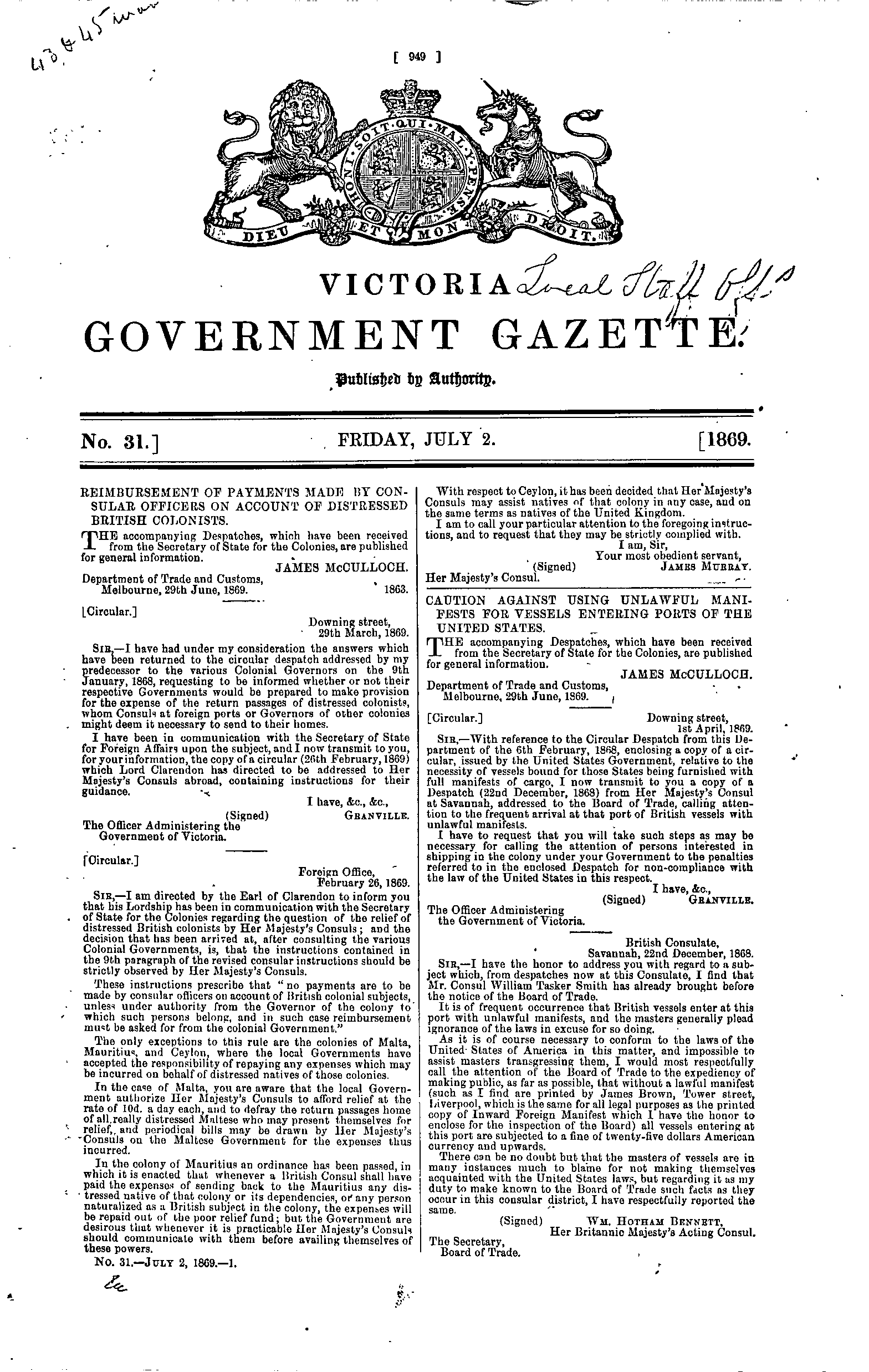 | Gazette 31, Date: Friday, July 02nd 1869 |