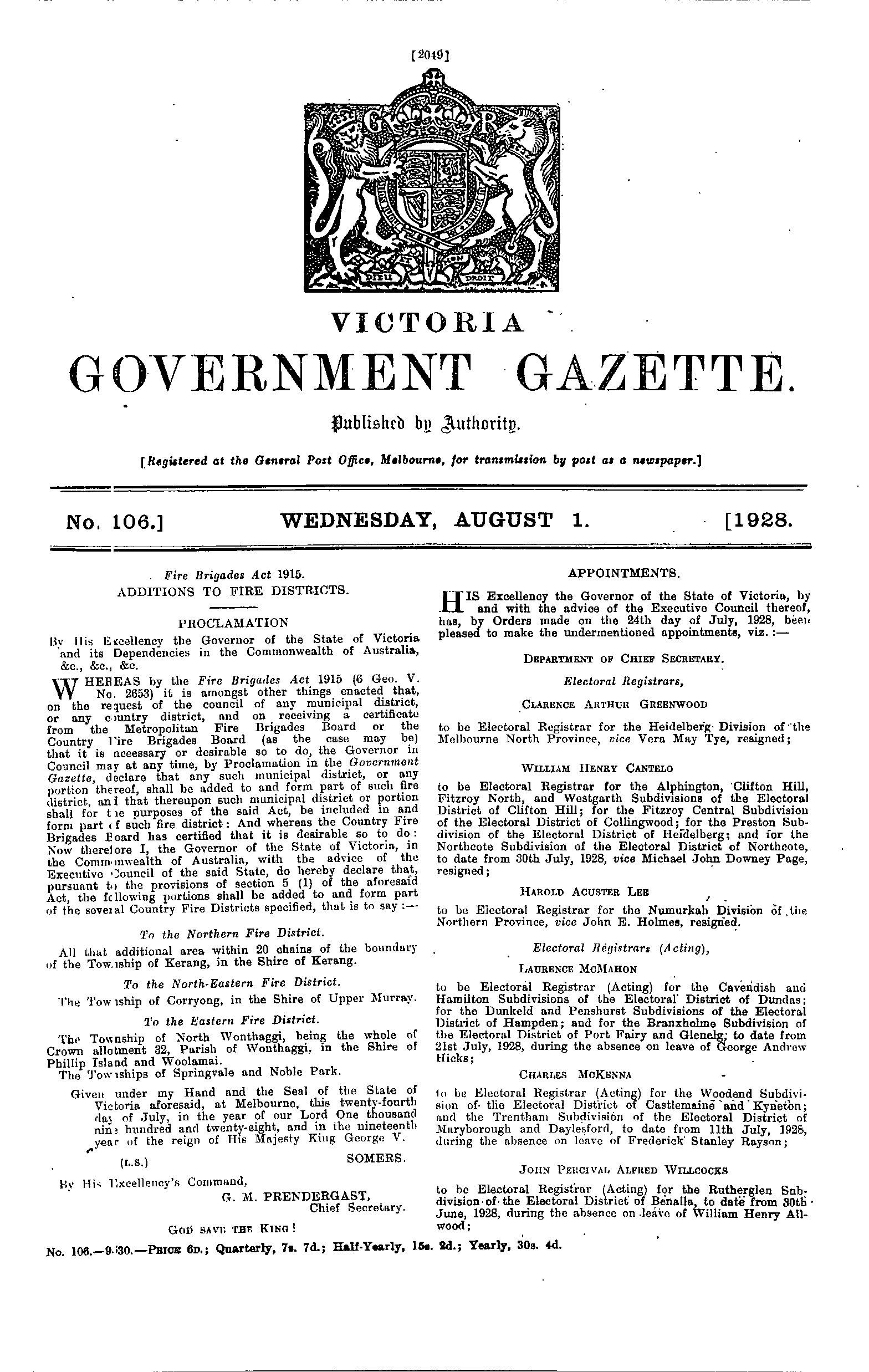 | Gazette 106, Date: Wednesday, August 01st 1928 |
