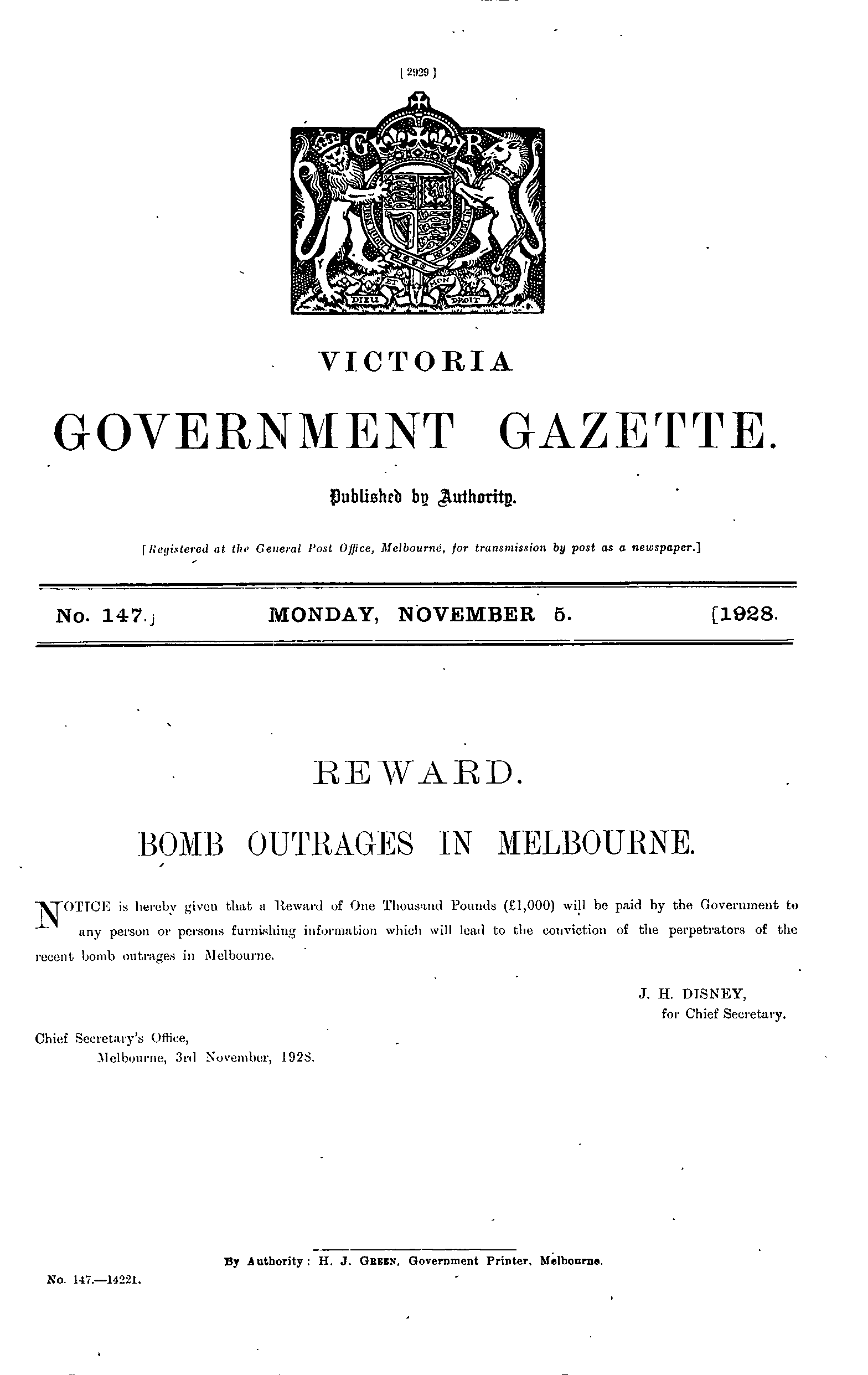 | Gazette 147, Date: Monday, November 05th 1928 |